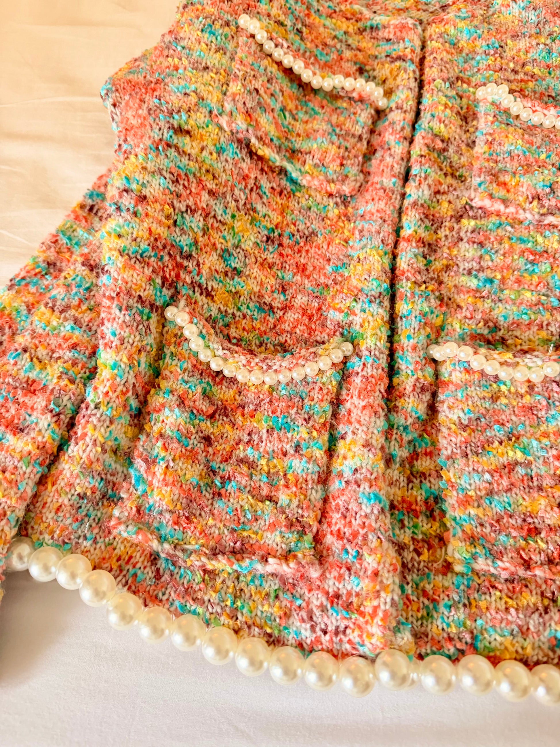 Pearl detailing accents the pockets, neckline, sleeves, and hem, adding a polished contrast to the playful knit. Designed to be worn like a jacket but feel like a sweater, it’s lightweight, soft, and effortlessly comfortable—perfect for dressing up even the simplest outfit.