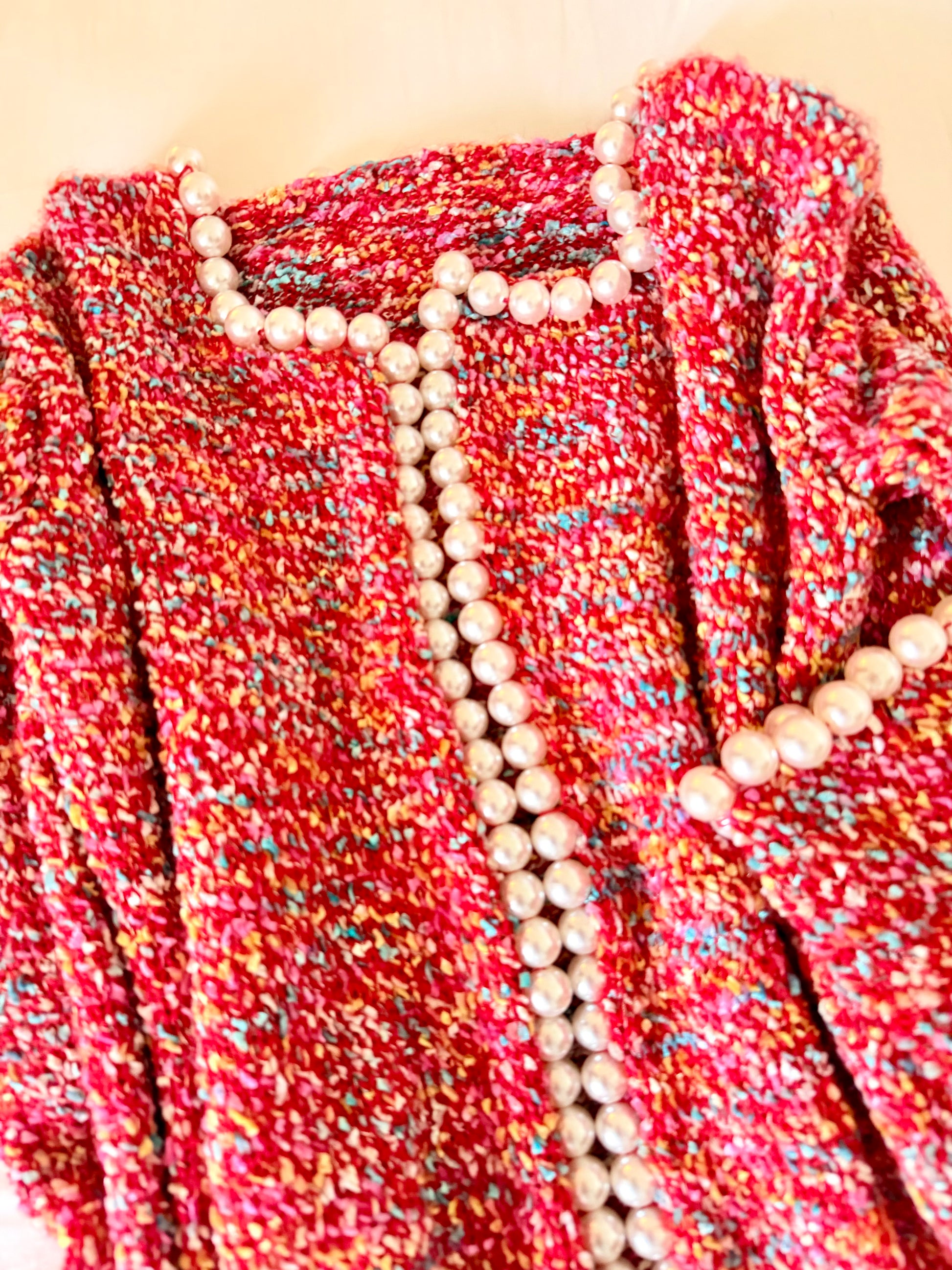 Pearl detailing across neckline, front, sleeves, and borders